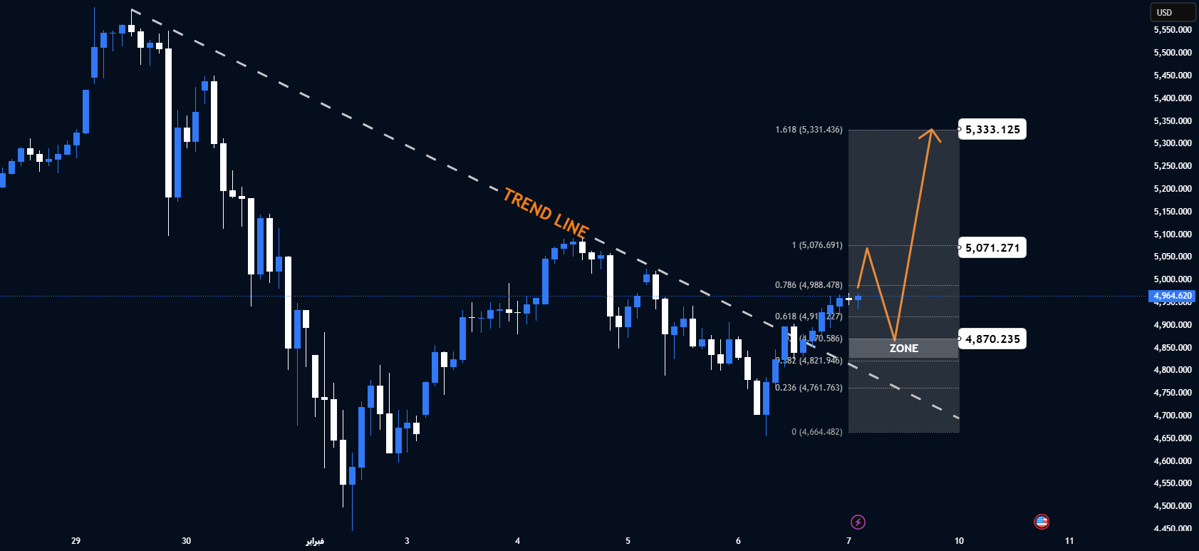 🎯 TP2: 5,333 (1.618 extended/primary recovery target)