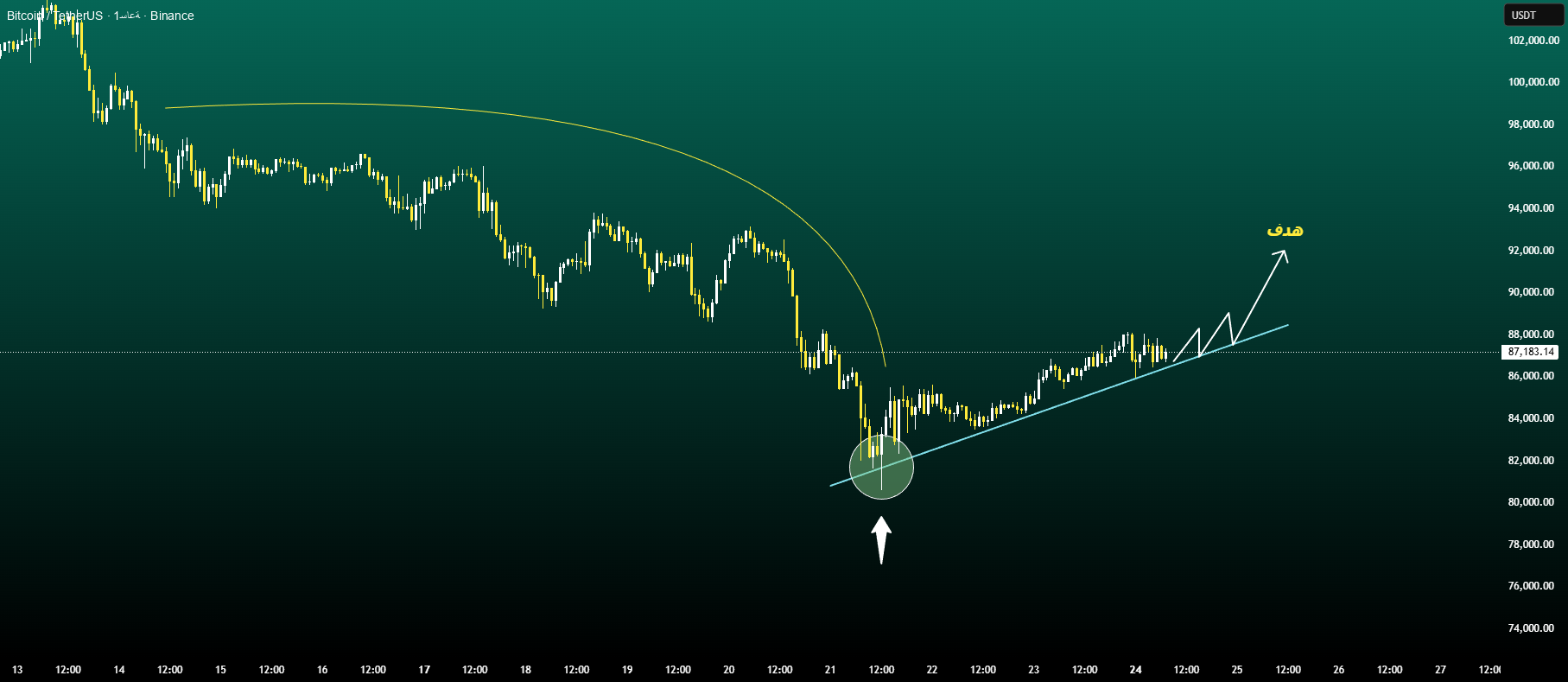 The 86,000-87,000 area represents new support, while successive retests suggest the short-term trend is shifting from bearish to cumulative recovery. The compressed oscillation pattern on the trend line currently corresponds to a continued upward move towards the target area with each step.