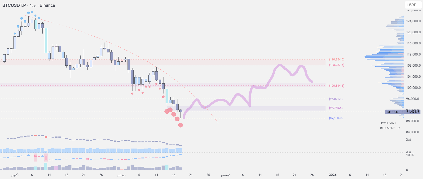 In our November 12 forecast, we noted that momentum could fade quickly if price formed new lower highs and fell back below the 107K resistance. The scenario came true: Bitcoin broke the 102K support level and slid to the 89K area.