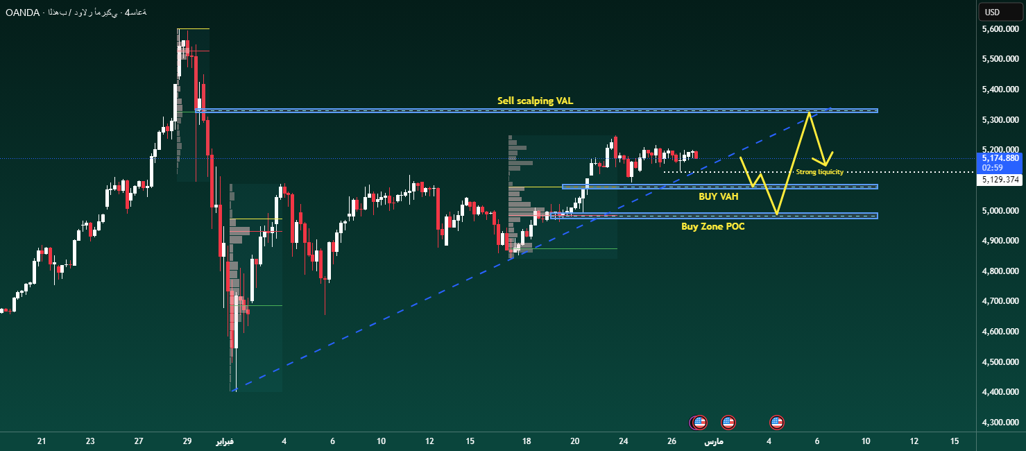 The overall trend remains upward and the trend line remains upward. The volume profile highlights three main references: POC around 5,000 points as a fundamental value buy zone, VAH around 5,12x as a pullback buy zone, and VAL around 5,33x as key resistance for profit taking or tactical scalping sales. Anticipate retracement before expansion – only act when value is confirmed.