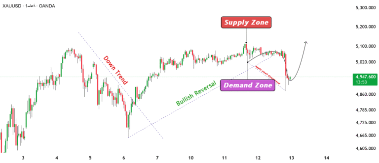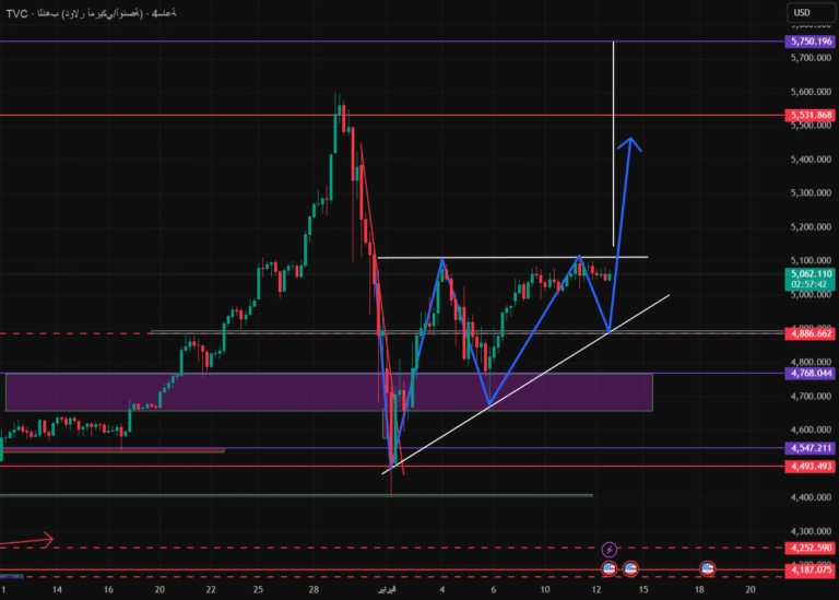 📊 On the 4-hour frame, a clear ascending triangle pattern forms before us, represented by: Horizontal resistance is 5100 – 5120 The rising trend line (white trend) supports the rising lows almost equal peak Consecutive higher lows reflect rising buying…
