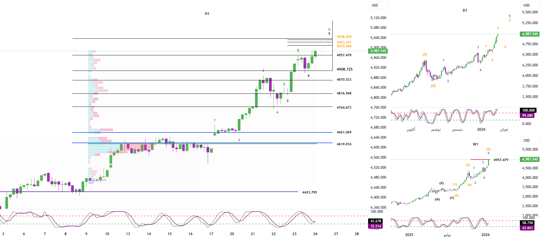 – Currently, there is a crossover area of ​​Fibonacci levels, as measured by the wave structure at different levels, intersecting in the price range between 5010 and 5038.