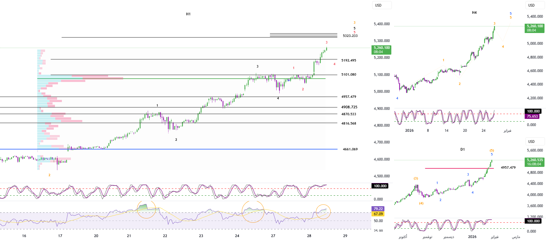– In the above chart, multiple Fibonacci levels of different wave structures intersect around the 5323 level.