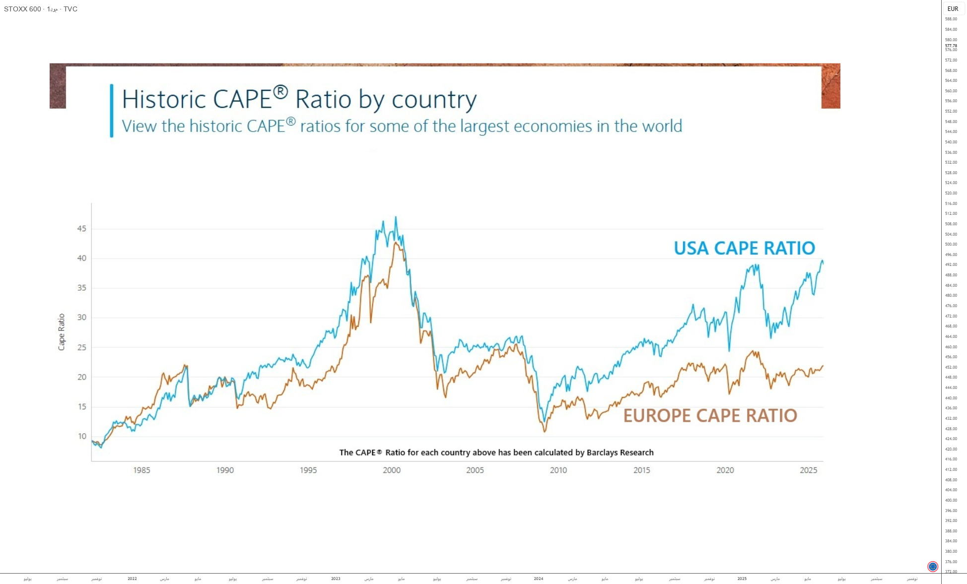 One of the strongest arguments in favor of European stocks is that their valuations are significantly lower than those of the U.S. market. The CAPE ratio (Shiller-adjusted earnings multiple), a valuation metric based on a 10-year average, illustrates this difference perfectly. Europe has generally had lower CAPE ratios than the United States over the past few decades, but the current gap has reached rare levels.