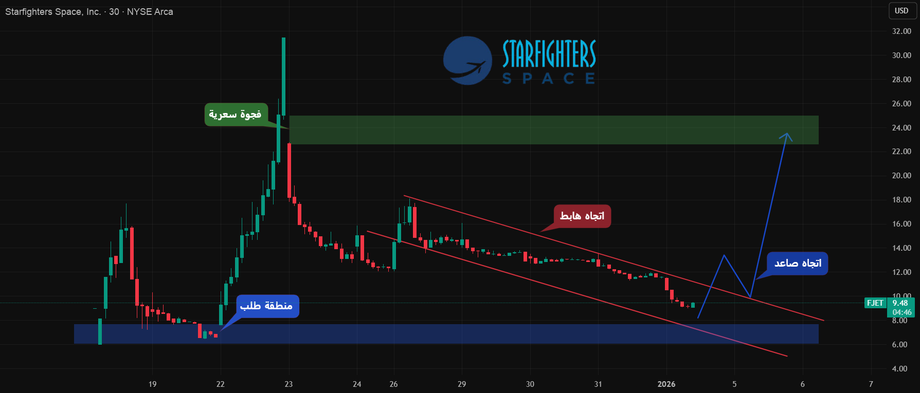 FJET is currently approaching the lower boundary of the descending channel while trading above the demand zone on the larger time frame.