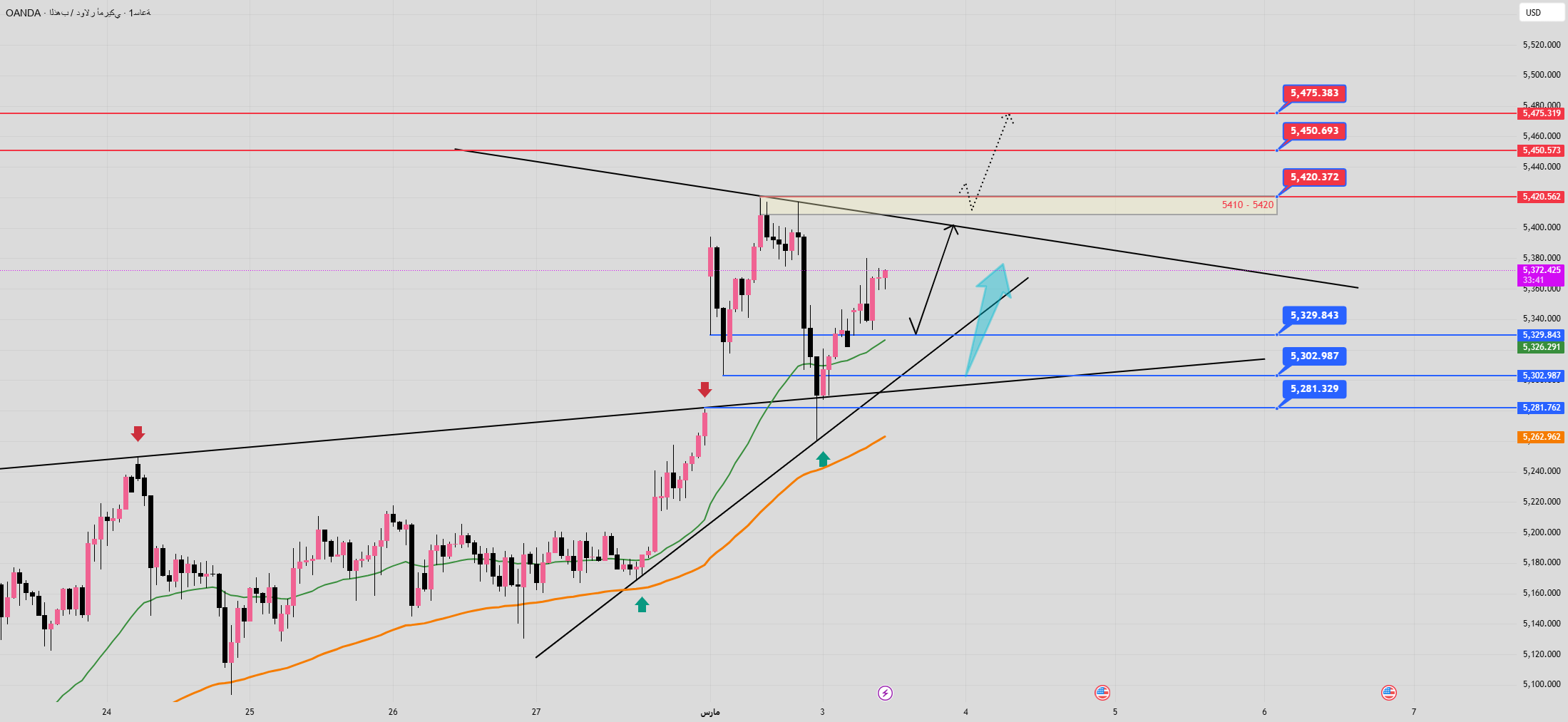 – If price mistakenly breaks out of the range (5410 – 5420), it may retest the range (5326 – 5331) or even reach the range (5303 – 5308) before breaking out again.