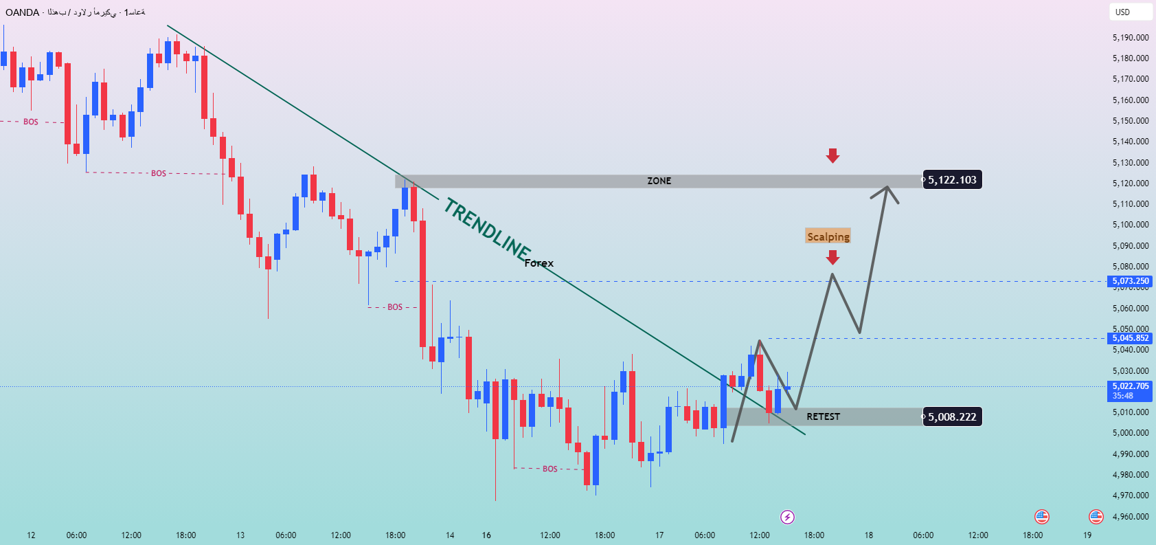 Price is currently reacting in the test zone around 5008, indicating that buyers are trying to regain control in the short term.