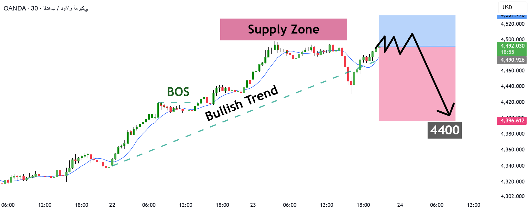 Gold recorded strong gains, reaching the 4497 area before encountering resistance and falling towards 4431. The price subsequently recovered and returned to around 4493, confirming this area as an important interactive level. Repeated tests of the highs suggest bullish momentum is beginning to wane and hesitation is emerging near the supply zone. After such a prolonged period of volatility, the market may enter a rebalancing phase. Looking at the current area, selling pressure may gradually build up, opening the way for a price correction. As volatility subsides, a move towards 4400 remains possible. At these levels, risk management remains critical.