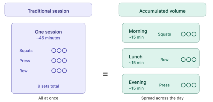 There is solid research showing that building up your training volume throughout the day (a set here, a set there) produces similar strength and muscle building results compared to a single traditional session, as long as the total volume and intensity are combined. (that is, you do the same amount of challenging things in total.)