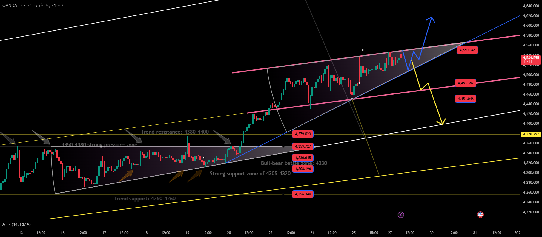 My personal opinion: Gold prices may first fall this week and then rise, reaching the $4,600 level, but may first fall back to support levels between $4,470 and $4,500.