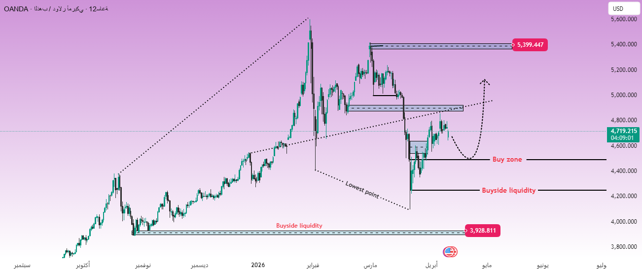 If gold continues to hold the 4,450 area and even tests the deeper 4,250 liquidity area, the market may start to build a stronger recovery round. In this case, the broader path remains in place, with room for a move back to higher resistance and eventually 5,399.
