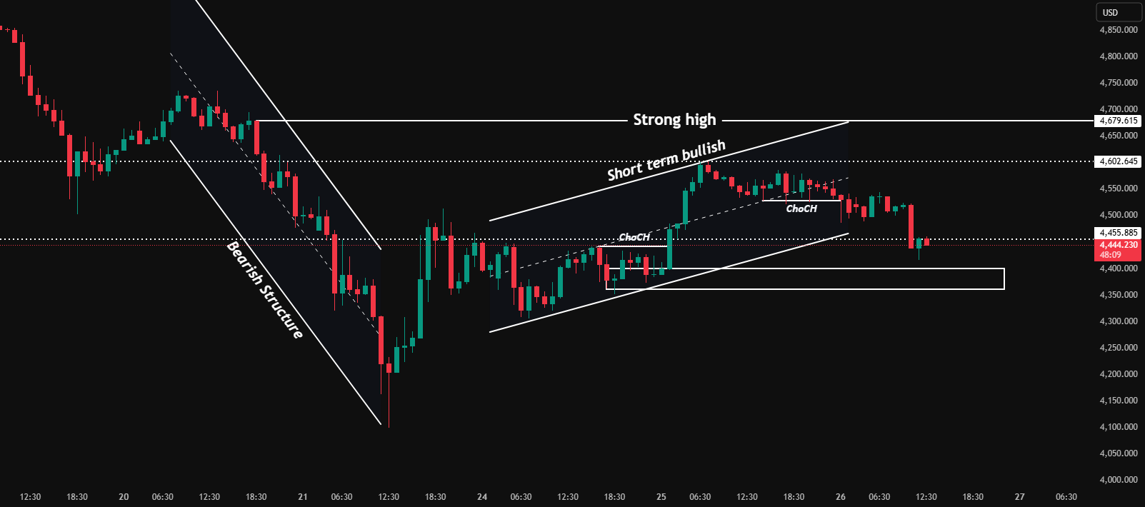On the hourly chart (H1), the price has formed an ascending channel, but multiple ChoCH signals have been issued, indicating weak bullish control. The recent push has pushed the price back into the FVG zone, suggesting efficiencies are being filled.