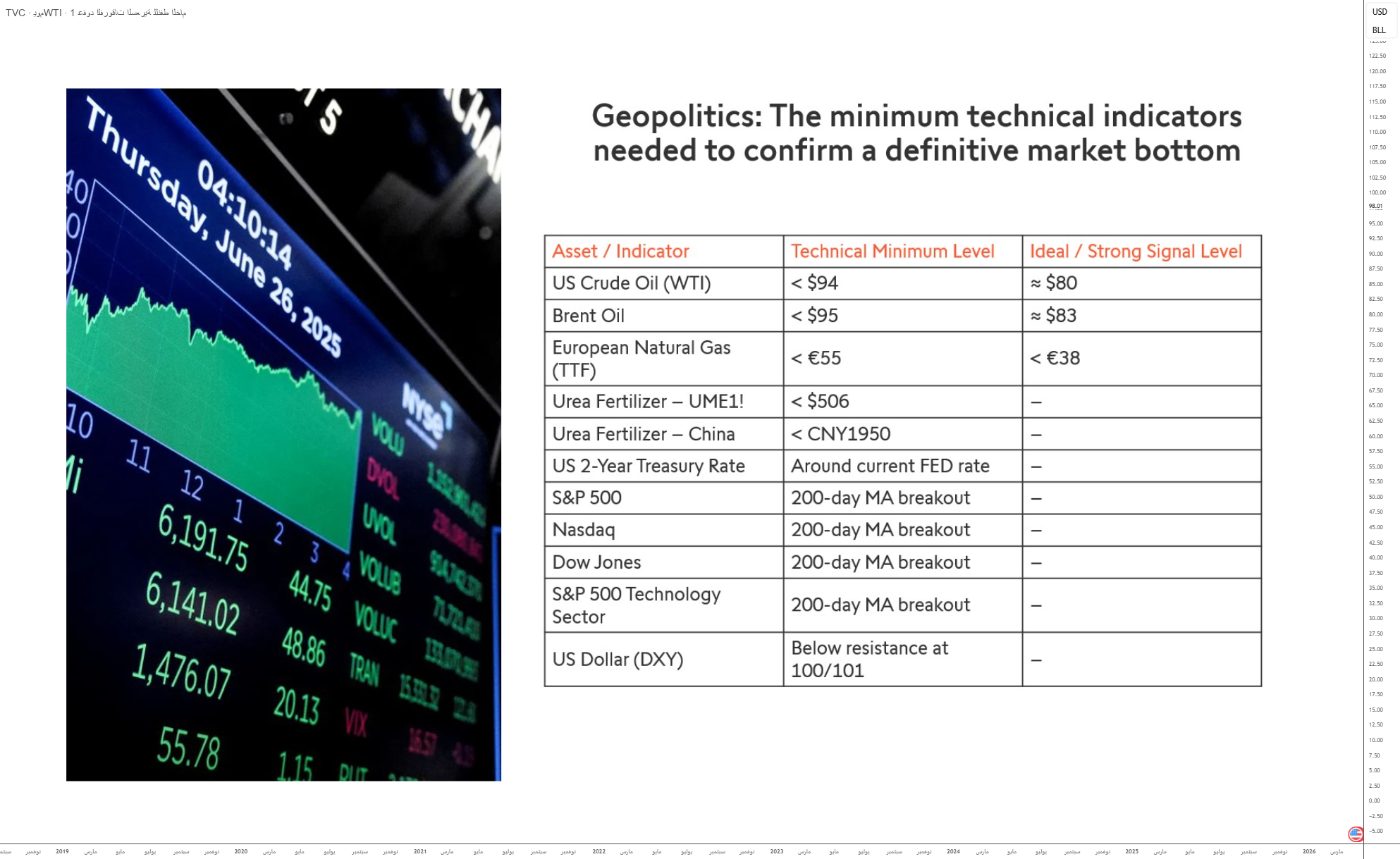Specifically, energy markets are the first leading indicator. A sustained decline in oil prices (WTI below $94, preferably closer to $80) would mark a significant decline in the geopolitical risk premium. The same analysis applies to Brent crude and European natural gas, as their return below critical levels will reflect a gradual return to stabilization in flows and expectations.
