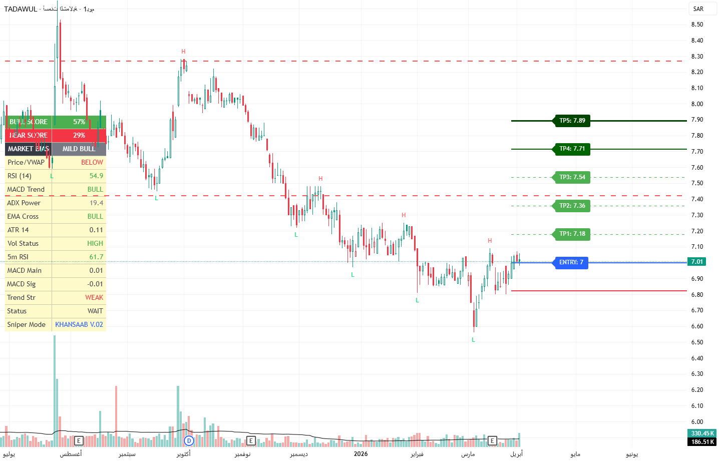Expected trade success rate: 57% (based on the bullish score shown in the indicator).
