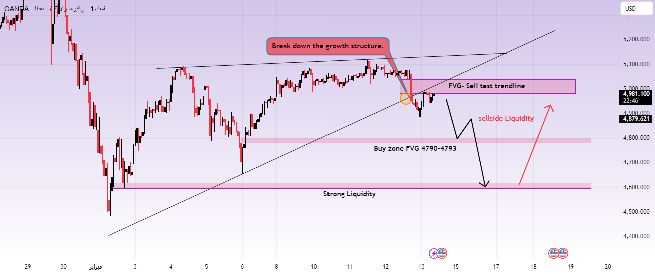 A breakout of a trendline structure will often trigger a retest before continuing. Unless gold prices forcefully reclaim the 5,020 area, the current consolidation appears to be a preparation for a liquidity-driven downward trend.