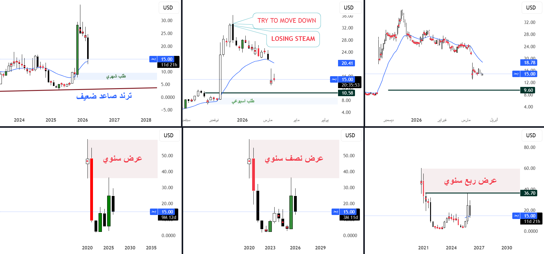 At this point, the details of the movement become clear. Buyers lose upward momentum (LOSING STEAM) and prices begin to move downward (TRY TO MOVE DOWN), targeting the area of strong buyer demand below. The uniqueness of the weekly demand area is its perfect overlap with the monthly demand area, whose evaluation is considered excellent considering the previous strong price explosions that started with it.