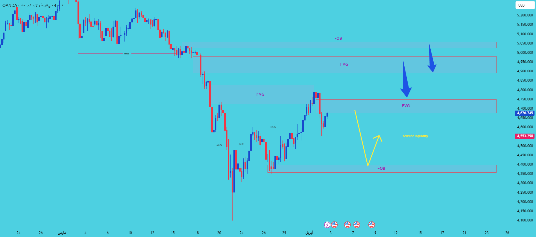 On the four-hour structure, gold remains within a bearish overall framework. The recent rebound has pushed the price to the FVG supply area around 4,700-4,800, where selling pressure has begun to arise again.