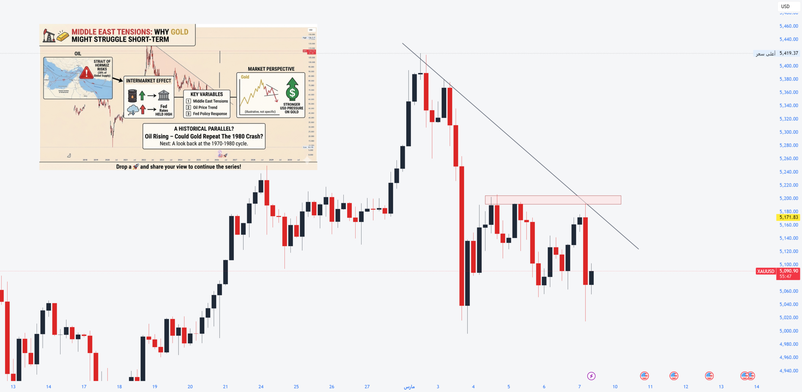 Geopolitical turmoil typically supports gold. However, in the current environment, higher oil prices may put short-term pressure on gold.