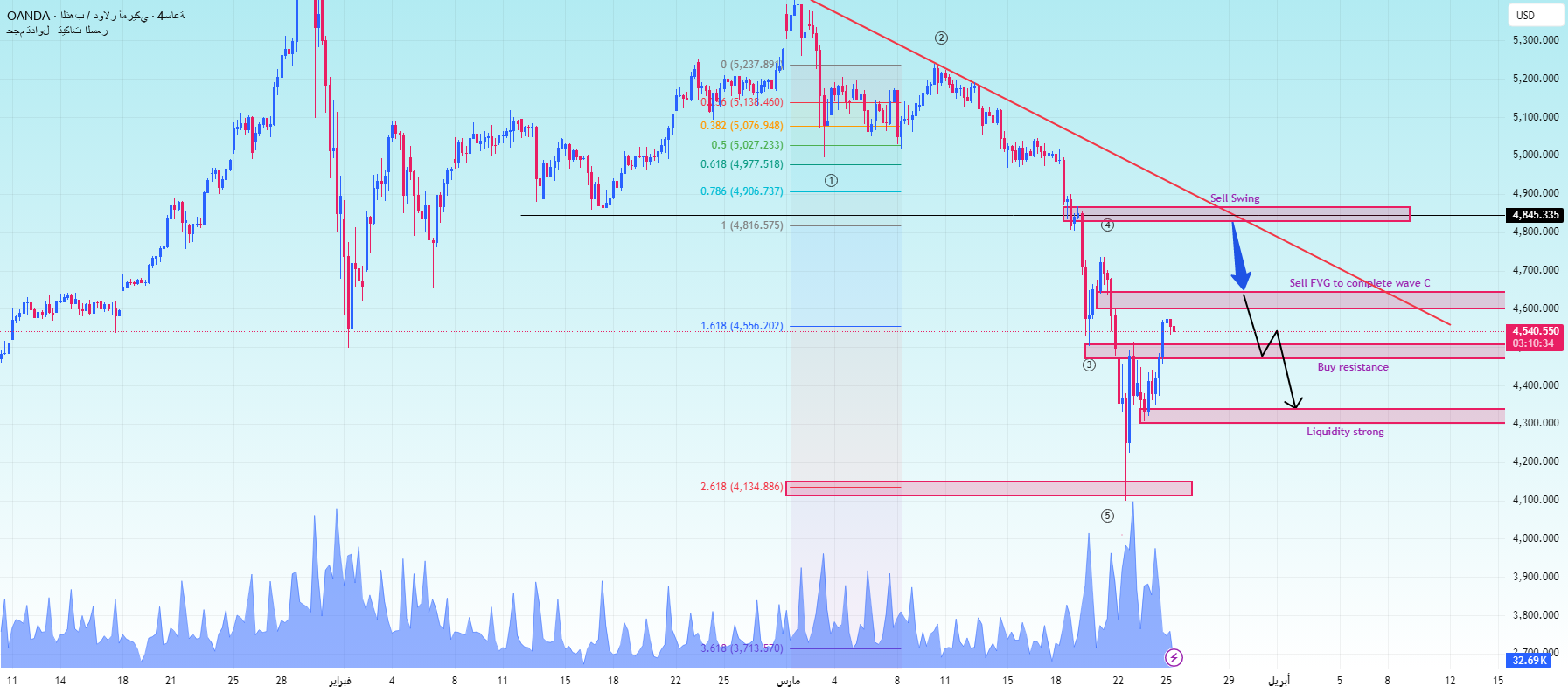 The current upward move is approaching the main reaction area around the 4500-4620 level, where the chart identifies the buy resistance area and sell FVG area completing the C wave. This creates an important area of convergence. If price continues to rise into this liquidity pocket, it may provide a cleaner position for sellers to enter based on the primary trend’s return.