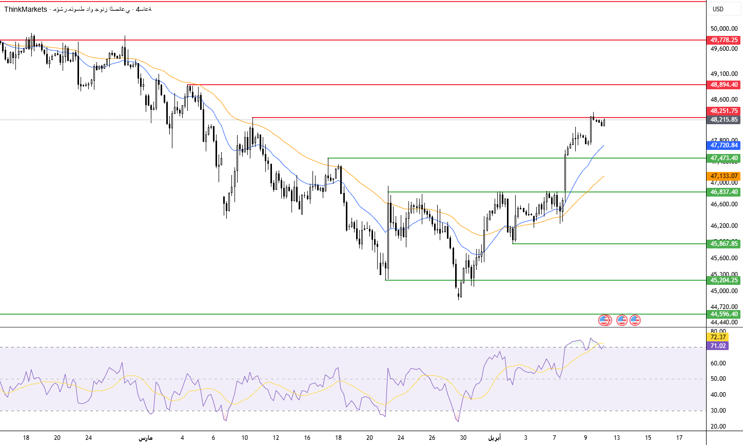 Based on the chart, we note that the Dow is experiencing a strong bullish surge after a series of successful bounces from previous support levels; this resulted in a test of around 48,251 points after breaking out and holding 46,837 points. Based on what we’ve seen from these moves, this suggests relative control on the demand side in the short term.