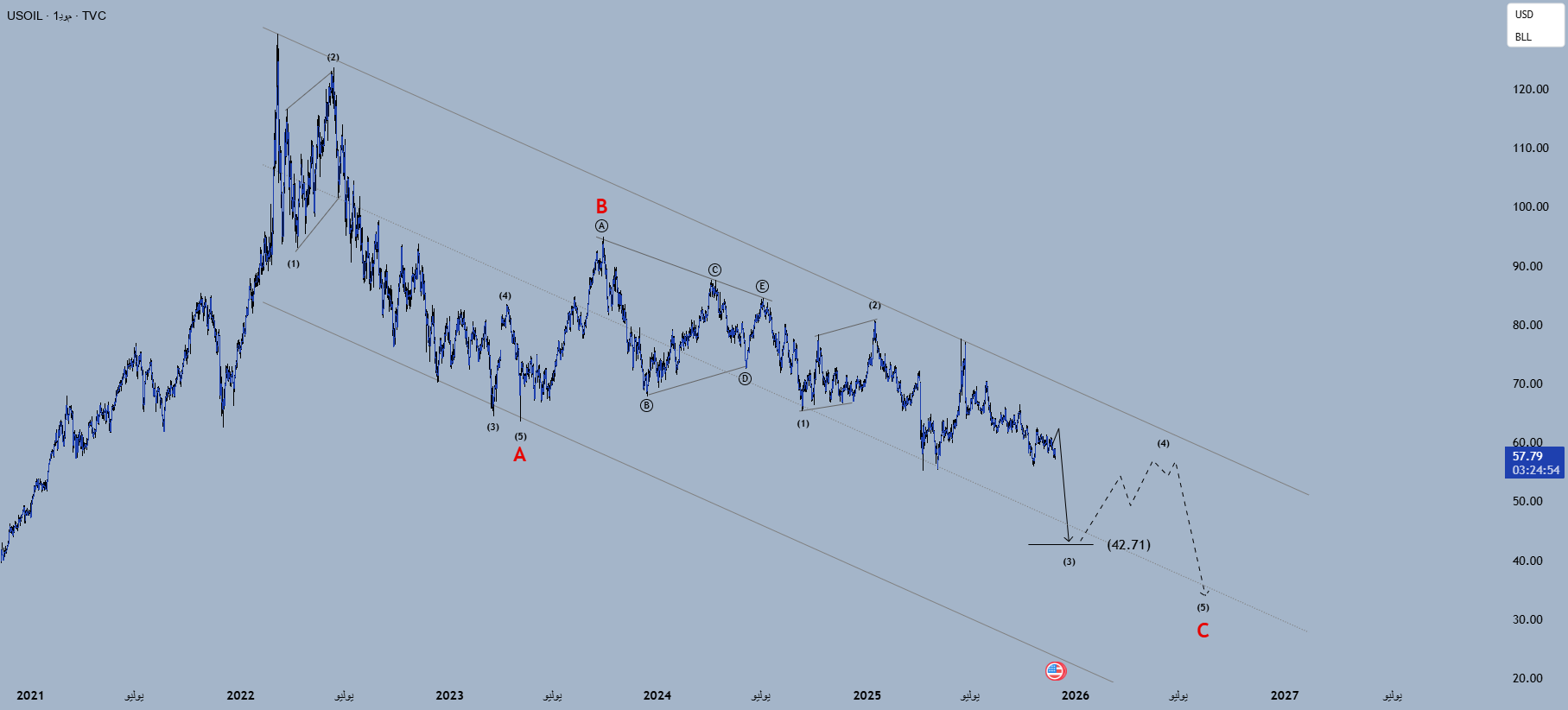 This is a simplified wave analysis of oil trends over the coming period. The clear pattern before us has been moving within a downward channel for a long time, while the numbers show that we are currently within a large A – B – C correction path.