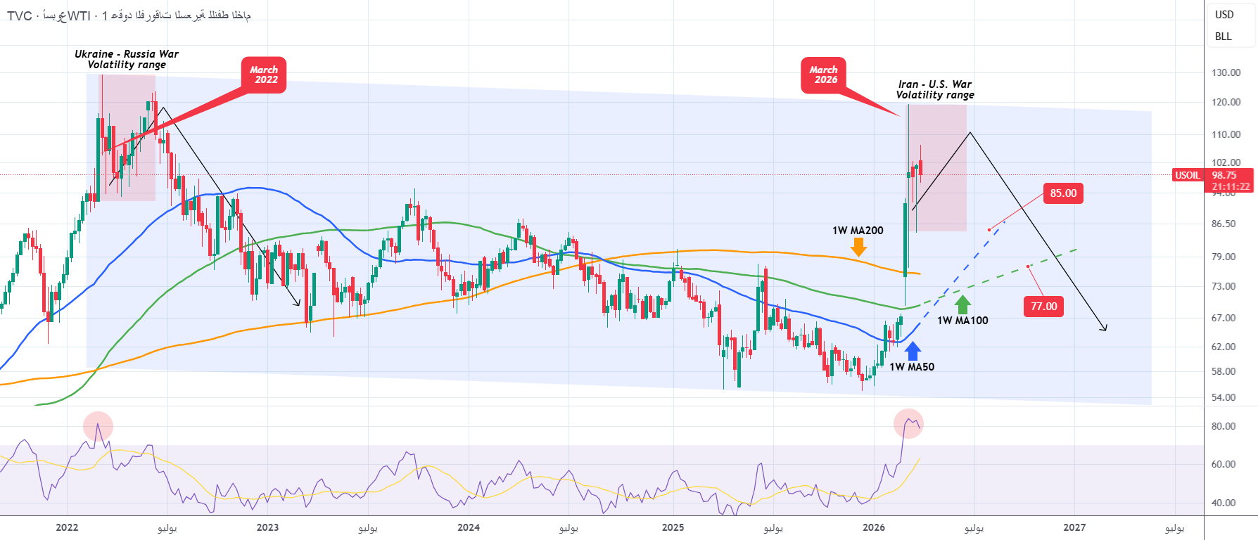 WTI Oil (USOIL) has embarked on an aggressive consolidation process since the war between the United States and Iran broke out a month ago. The volatility is so high that there is no clear trend and it is almost impossible for the market to stabilize and reach the high or low of the 09 Mar 1W candle.