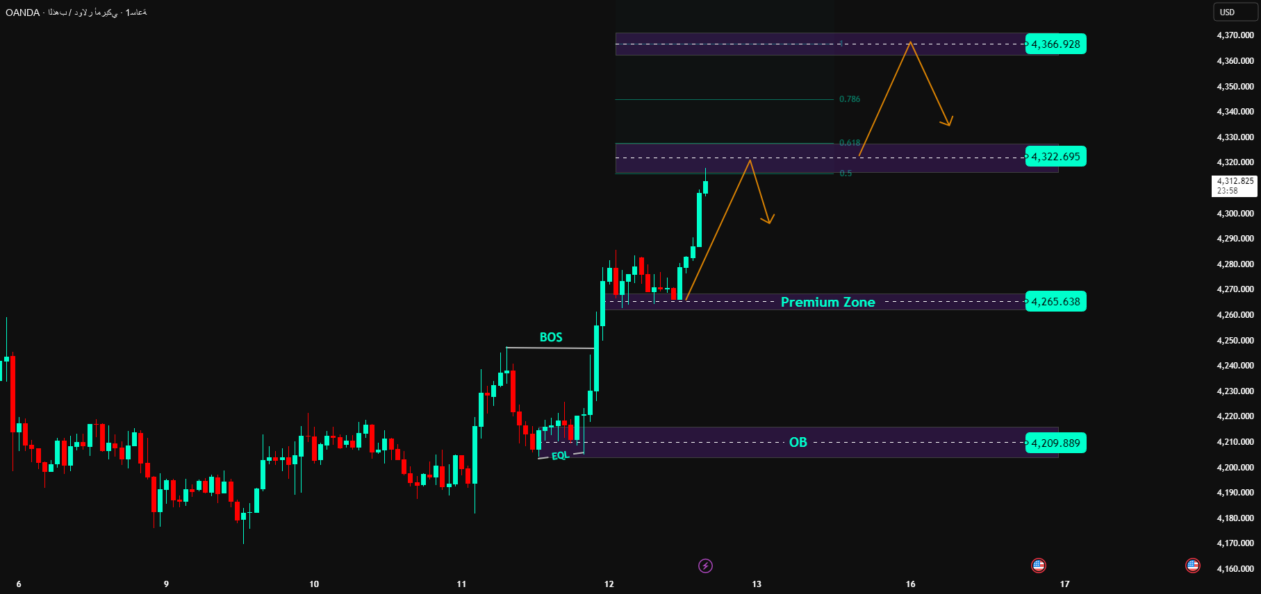 The price is holding above premium territory near 4,265, indicating that the bullish structure continues and classifying the pullback as a technical correction.