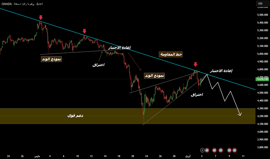 Retest: Price retests the major descending resistance line (around $4,700).