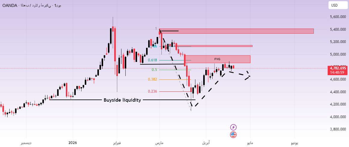 This is the most important near-term supply area on the chart. Sellers are also likely to remain active unless buyers can break out with stronger momentum. As long as gold prices remain below this area, the recovery still looks corrective rather than impulsive.