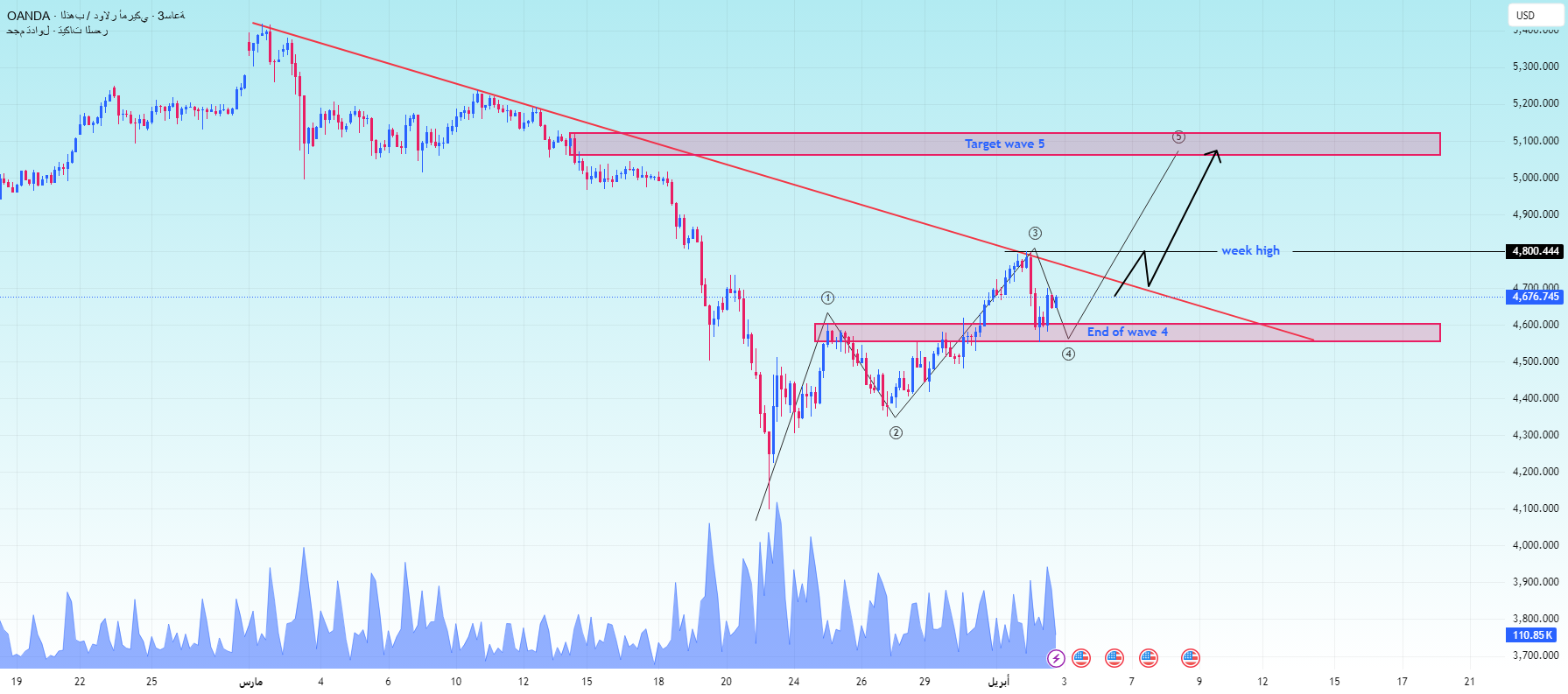 Looking at the chart, the next important level is the weekly high near 4800.4. This is the breaking point that buyers need to recapture to confirm new momentum. If the price breaks this area and stabilizes above it, the next extension could open towards the 5100 area, which is marked as the main target for the fifth wave.
