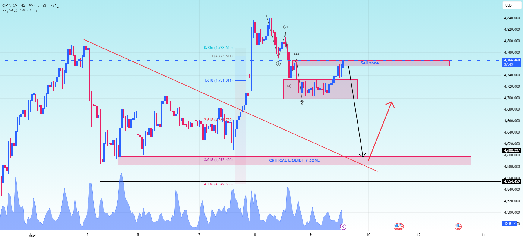 Below current prices, the chart highlights key liquidity areas around 4580-4608. This is a key area of support to watch if gold begins to move back from resistance. A move toward this area would be consistent with the view that the current recovery is only temporary and that the market is still preparing for another phase of decline.