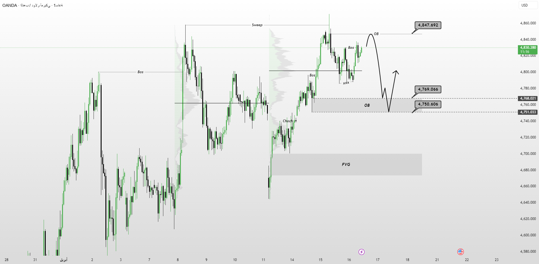 Conditions: Wait for the price to drop to the $4,750 – $4,768 area (FVG + OB).