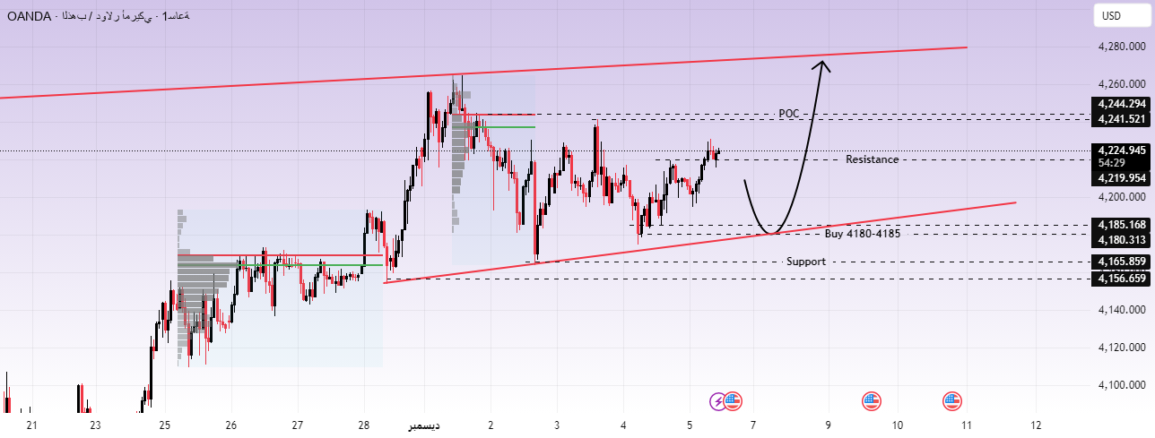 First Half Time Frame: Gold is trading in an ascending price channel, with the final low higher than the previous low. The channel’s lower trendline crosses the 4180-4185 area.