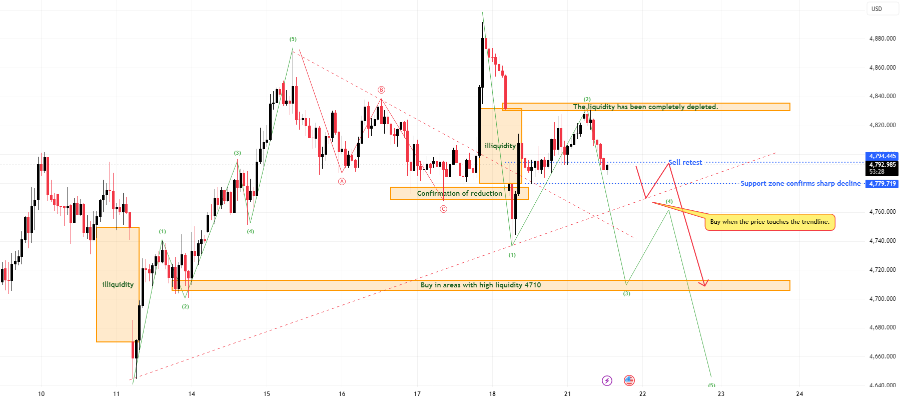 The Elliott structure on the chart suggests that price may complete a second wave in a broader downward sequence, while the resistance area at 4812 remains a key area where sellers can regain control again.