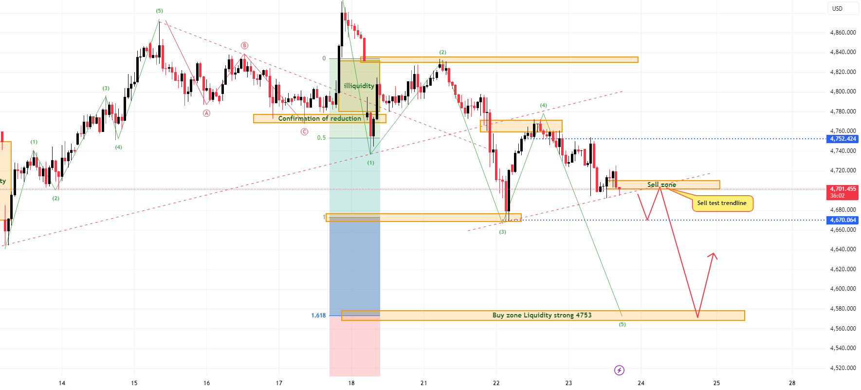 The broader chart still looks defensive. The price has rebounded from the 4670 support area, but the rebound remains limited and unstable. More importantly, gold prices are still trading below the overhead resistance level, which means that buyers have created a rebound, but it is not a true structural reversal.