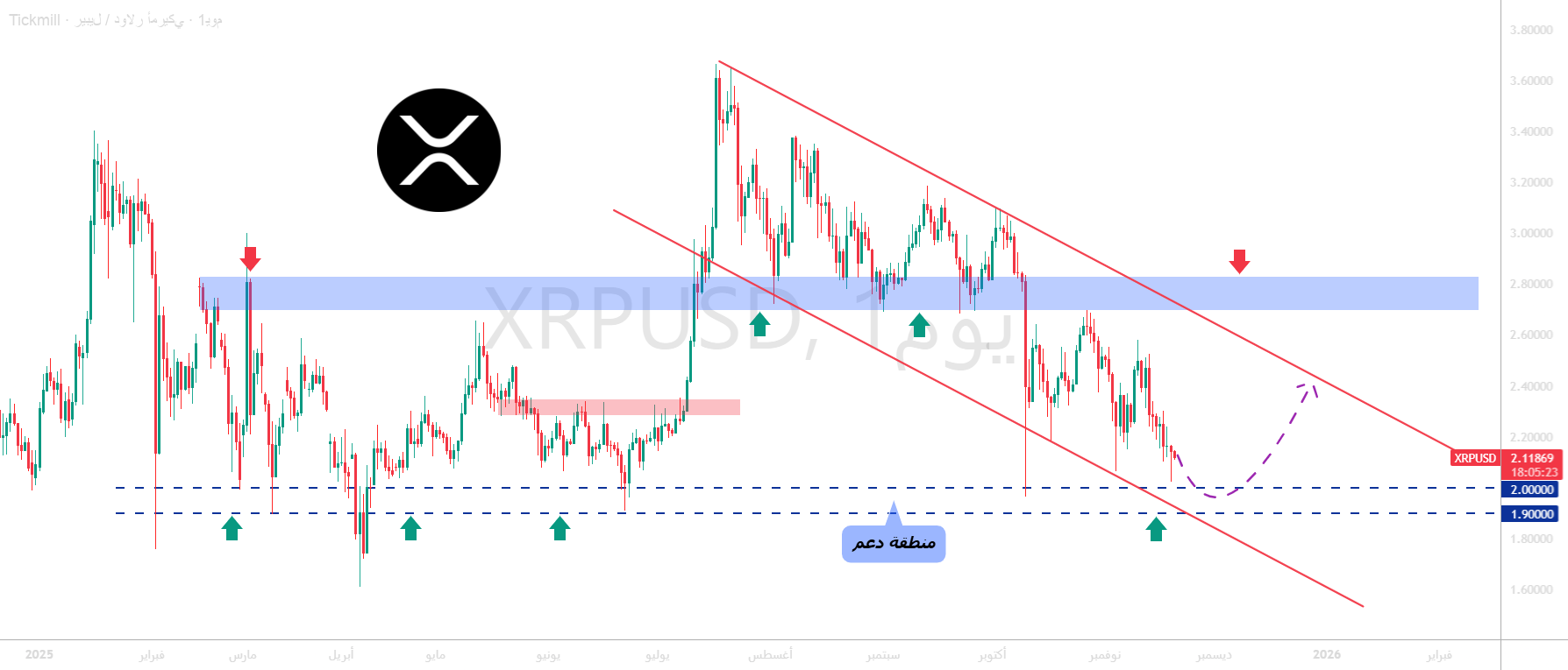 XRP is trading within a clear bearish channel on the daily frame, as the price continues to make lower highs and lower lows on every upward attempt. However, the price is now starting to approach a very strong support area between 1.90 and 2.00, as indicated by the green arrow, an area from which the price has bounced several times before.